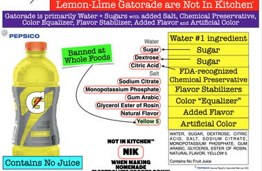 - Gatorade contains genetically engineered ingredients, such as modified food starch, citric acid, and sodium citrate, food coloring (which has a whole list of it's own poison effects)