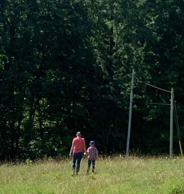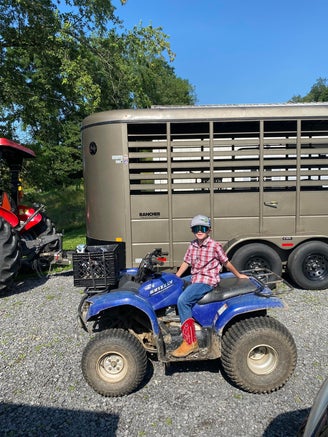 Early in the morning, before the sun got too hot, we got ourselves ready. We were having abnormally hot weather in WV with temps in the high 90's. Henry was excited to drive me down to the property on his 4-wheeler to meet Jeff with the cattle trailer and tractor.